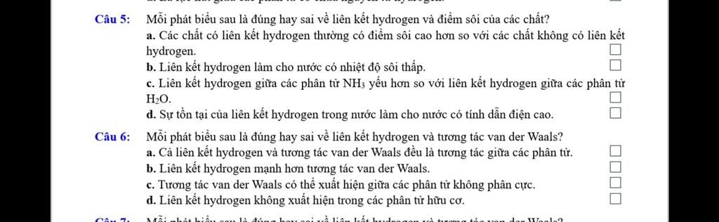 b) sai, liên kết hydrogen làm cho nước có nhiệt độ sôi cao