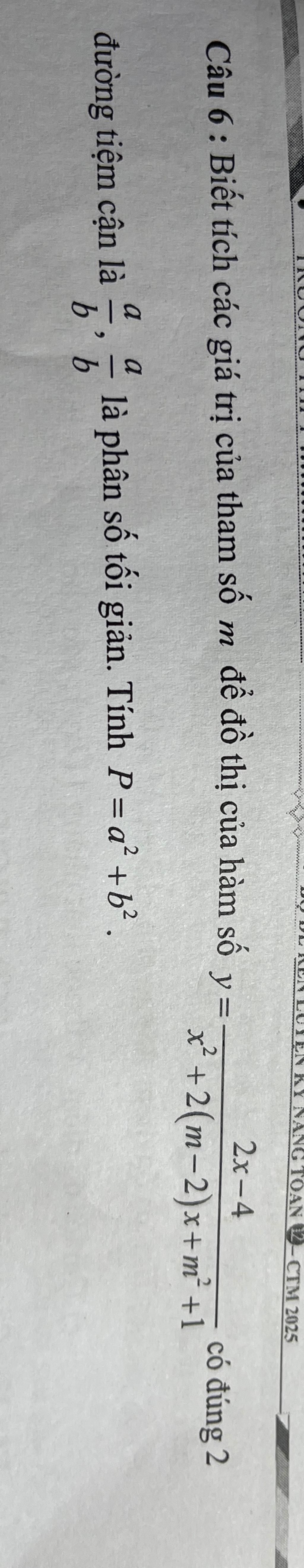 biết tích các giá trị của tham số m để đồ thị của hàm số y = 2x-4/x² + 2(m-2)x+m² +1 có đúng 2 đường tiệm cận là a/b,a/b là phân số tối giản. tính p = a² + b².