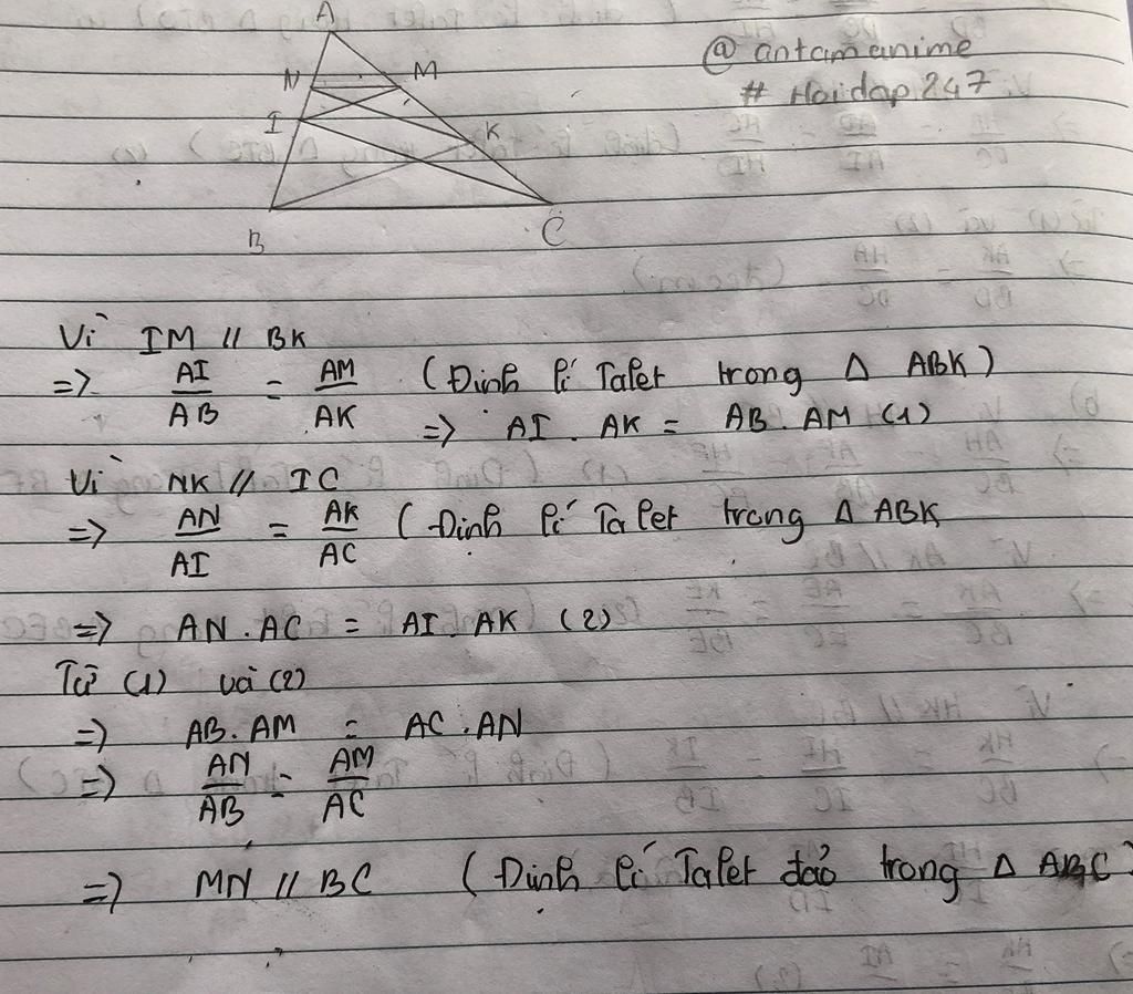 ⇒ $\frac{AK}{AI}$ $=$ $\frac{AN}{AI}$ $(định lí talet)$
