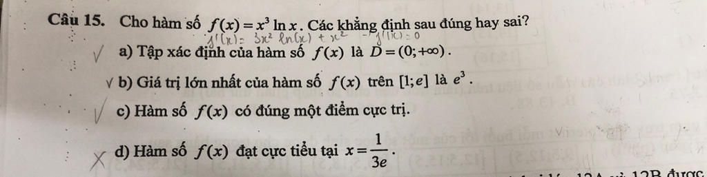 `f^'(x)=0<=>[(x^2=0),(3lnx+1=0):}<=>[(x=0\ "(loại)"),(x=e^(-1/3)=1/(root[3](e)) notin [1;e]):}`