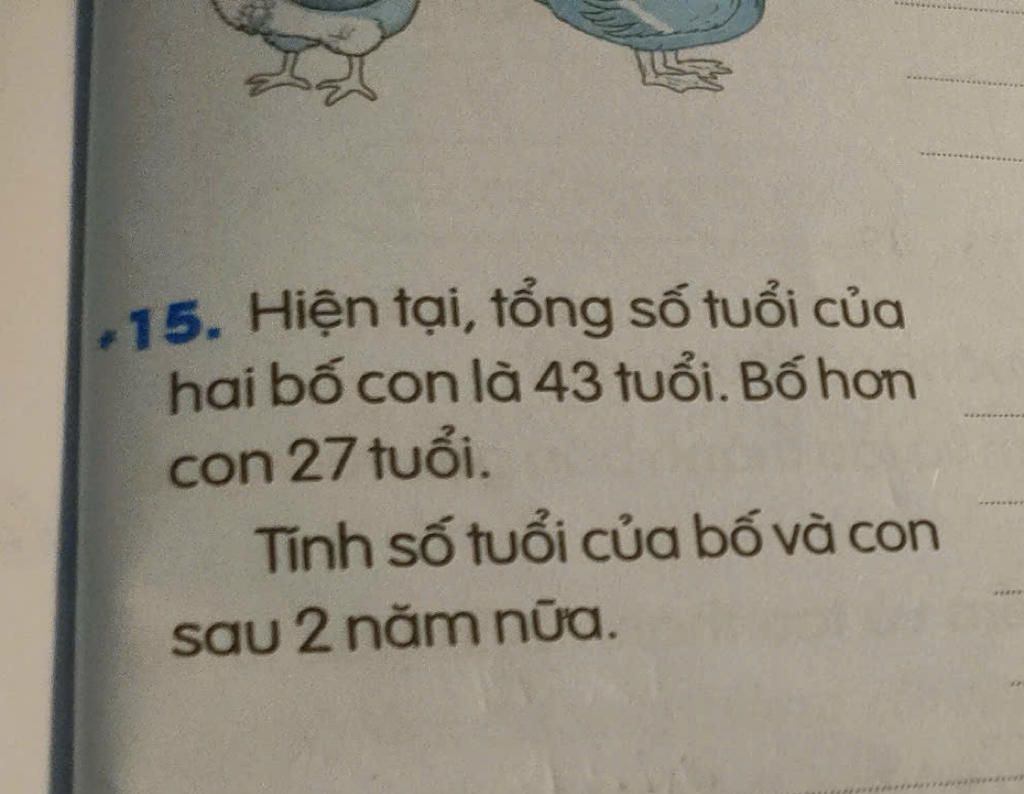 ` ( 43 + 27 ) : 2 = 35 ( tuổi ) `