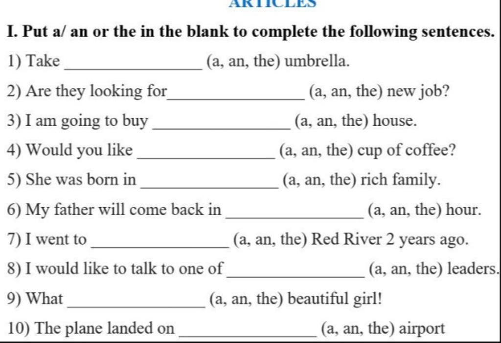 `-` a, an dùng cho danh từ đếm được số ít chỉ sự vật chưa xác định cụ thể