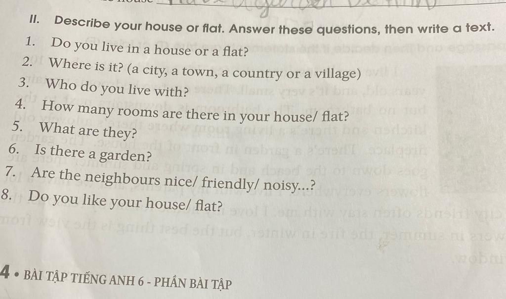 I live in a flat.It's in Ha Noi city.I live with my parents , my little sister and my little brother.My flat has 7 rooms.They're 3 bedrooms , 2 bathrooms , 1 kitchen, 1 living room and 2 balconys.My flat doesn't have a garden.My neighbours are friendly and helpful.I really like my flat.