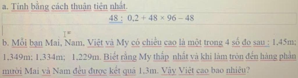 Ta có : Chiều cao của bạn My làm tròn đến hàng phần mười là : `1,229` `~~` `1,2`