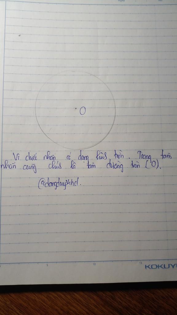Trọng tâm của đường tròn là điểm O (giao điểm hai đường kính,cách đều các điểm nằm trên đường tròn)->Trọng tâm O không nằm trên chiếc nhẫn mà thuộc phần không khí trong chiếc nhẫn