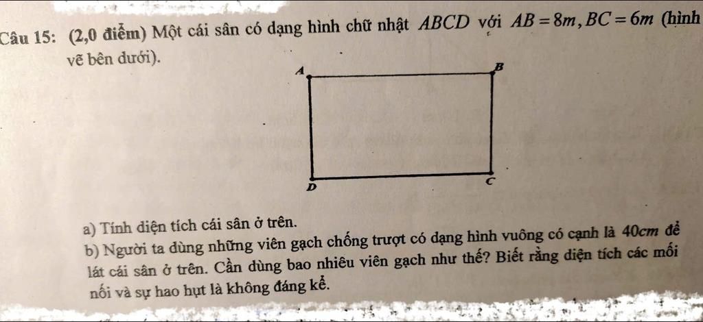 b) Diện tích mỗi viên gạch là: `40*40=1600(cm^2)=0,16(m^2)`