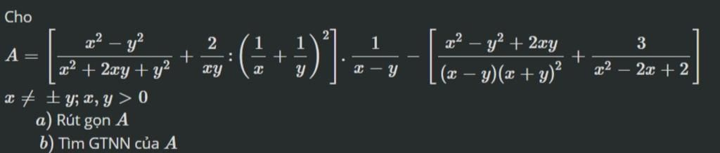 `A = [(x^2 -y^2)/(x+y)^2 + 2/(xy) . (xy)^2/(x+y)^2] . 1/(x-y) - [(x^2-y^2 + 2xy)/((x-y)(x+y)^2) + 3/(x^2 - 2x+2)]`