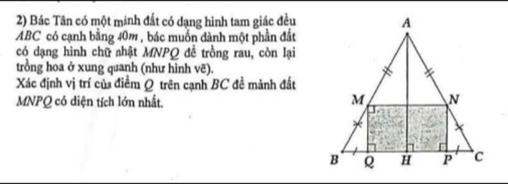 $\to S_{MNPQ}=\dfrac{(40-x)\sqrt3}2\cdot x=\dfrac{\sqrt3}2\cdot x(40-x)\le \dfrac{\sqrt3}2\cdot \dfrac14(x+40-x)^2=200\sqrt3$