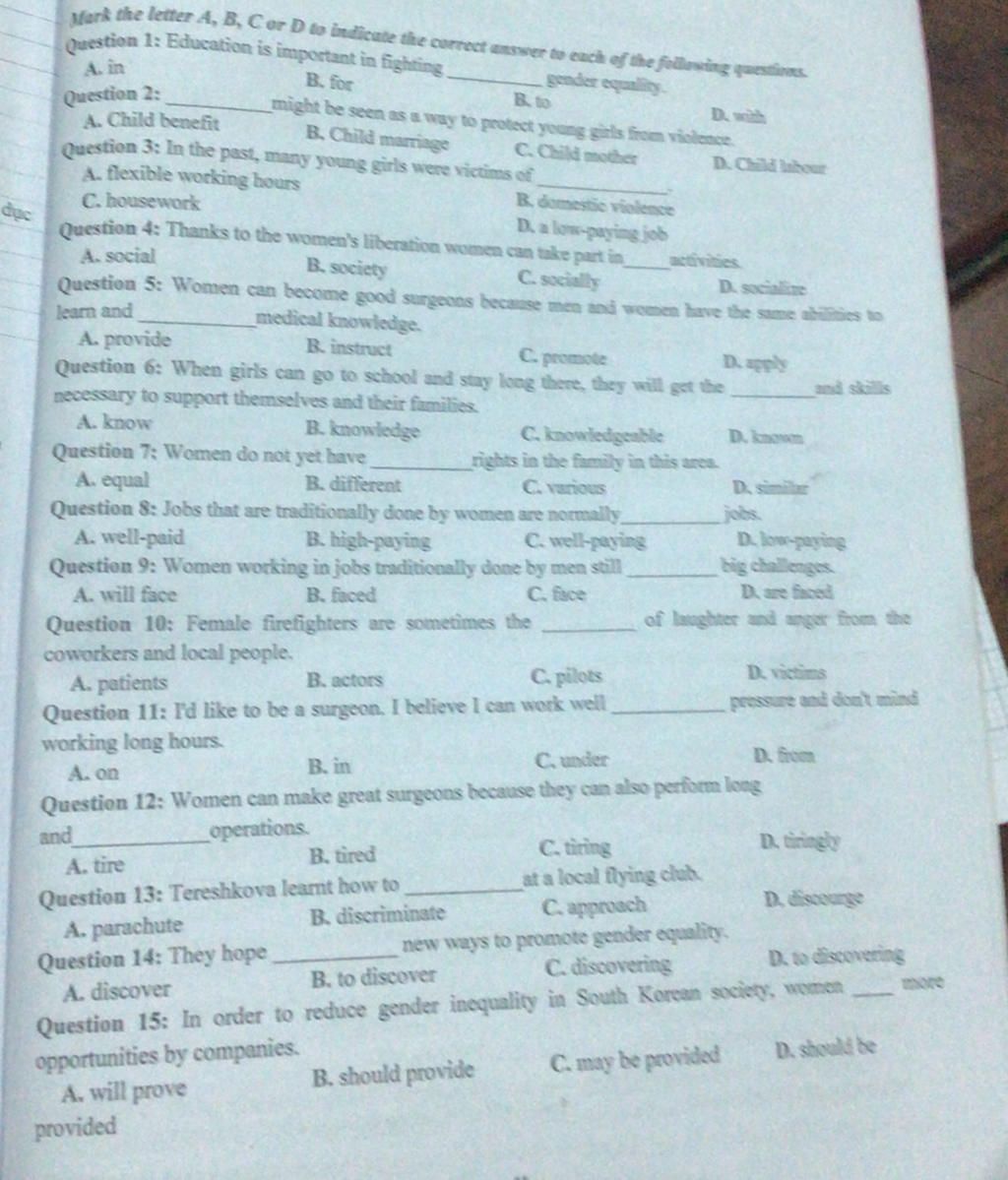 Mark the letter A, B, C or D to indicate the correct answer to each of the following questions