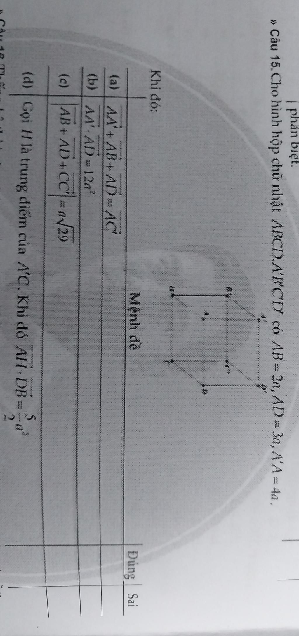 `\vec{AH}.\vec{DB}=(\vec{A A'}+\vec{A'H})\vec{DB}=(\vec{A A'}+1/2\vec{A'C})\vec{DB}=(\vec{A A'}+1/2\vec{A'B'}+1/2\vec{A'D'}+1/2\vec{A'A})(\vec{DA}+\vec{DC})=(1/2\vec{A A'}+1/2\vec{A'B'}+1/2\vec{A'D'})(\vec{DA}+\vec{DC})=1/2\vec{A'B'}\vec{DC}+1/2\vec{A'D'}\vec{DA}=1/2(\vec{AB}^2-\vec{AD}^2)=0`
