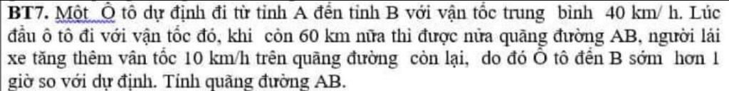 Thời gian dự định ô tô đi từ $A$ đến $B$ là $\dfrac{x}{40}(h)$