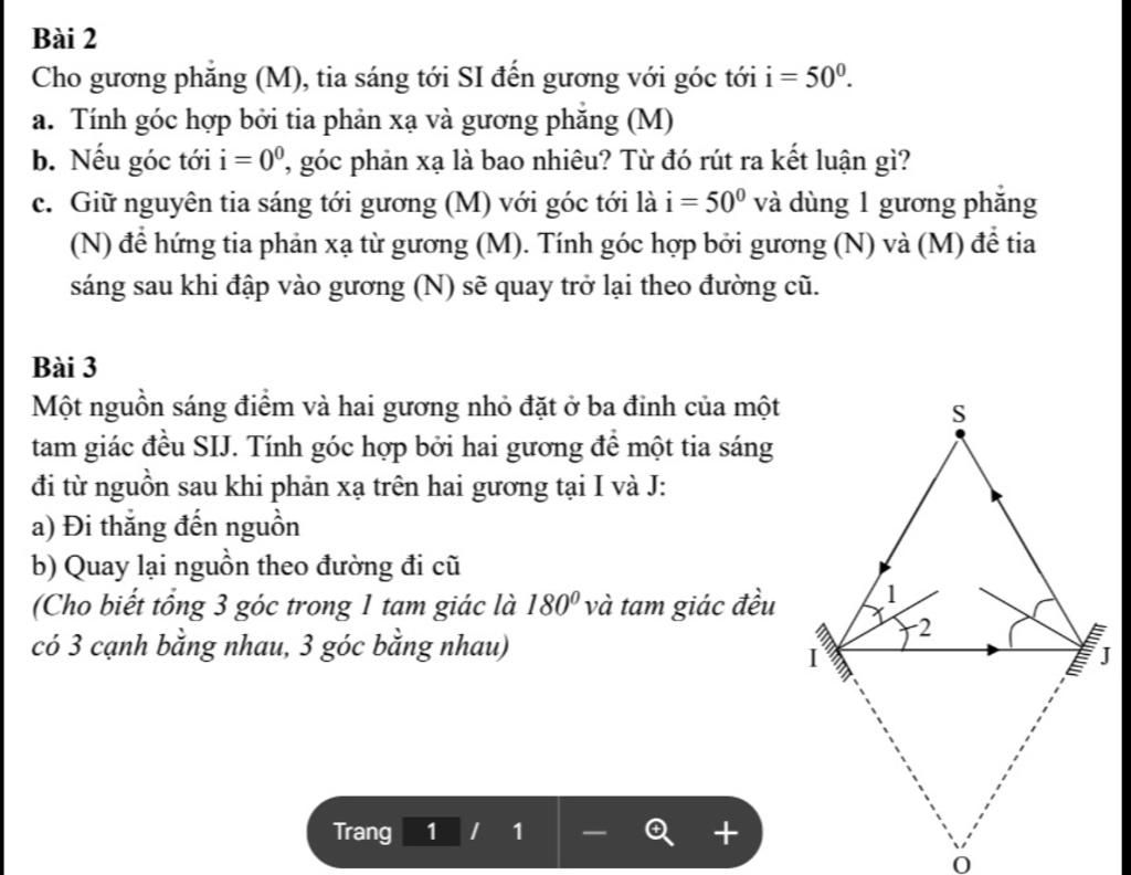 Bài 2 a) Tính góc hợp bởi tia phản xạ và gương phẳng 𝑀 M: Góc tới 𝑖 = 5 0 ∘ i=50 ∘ , theo định luật phản xạ, góc phản xạ 𝑖 ′ = 𝑖 = 5 0 ∘ i ′ =i=50 ∘ . Góc hợp bởi tia phản xạ và gương là 9 0 ∘ − 𝑖 ′ = 9 0 ∘ − 5 0 ∘ = 4 0 ∘ 90 ∘ −i ′ =90 ∘ −50 ∘ =40 ∘ . b) Nếu góc tới 𝑖 = 0 ∘ i=0 ∘ : Khi đó, góc phản xạ 𝑖 ′ = 0 ∘ i ′ =0 ∘ . Tia tới và tia phản xạ đều vuông góc với mặt gương, tức tia sáng đi thẳng lại theo phương ban đầu. Kết luận: Khi tia tới vuông góc với mặt gương ( 𝑖 = 0 ∘ i=0 ∘ ), tia sáng phản xạ không bị lệch hướng mà tiếp tục đi thẳng. c) Sử dụng thêm một gương phẳng 𝑁 N: Để tia sáng sau khi phản xạ trên 𝑁 N quay trở lại theo đường cũ, góc giữa hai gương 𝛼 α phải bằng 9 0 ∘ − 𝑖 = 9 0 ∘ − 5 0 ∘ = 4 0 ∘ 90 ∘ −i=90 ∘ −50 ∘ =40 ∘ . Bài 3 Giả thiết: Tam giác 𝑆 𝐼 𝐽 SIJ đều, tổng ba góc bằng 18 0 ∘ 180 ∘ , mỗi góc trong tam giác bằng 6 0 ∘ 60 ∘ . a) Tính góc hợp khi tia sáng đi thẳng đến nguồn: Tia sáng đi từ 𝑆 S, phản xạ tại 𝐼 I, sau đó phản xạ tại 𝐽 J, rồi quay lại nguồn 𝑆 S. Góc hợp bởi hai gương 𝐼 I và 𝐽 J là góc tại 𝑆 S, bằng 6 0 ∘ 60 ∘ . Khi tia sáng đi thẳng đến nguồn, góc hợp bởi hai tia phản xạ là 2 × g o ˊ c tại 𝑆 = 2 × 6 0 ∘ = 12 0 ∘ 2×g o ˊ c tại S=2×60 ∘ =120 ∘ . b) Tính góc hợp khi quay lại nguồn theo đường cũ: Tia sáng phản xạ tại 𝐼 I và 𝐽 J sẽ quay lại đúng đường cũ nếu tổng góc phản xạ trên hai gương là 36 0 ∘ 360 ∘ . Trong trường hợp này, góc quay của tia sáng trên mỗi gương là 18 0 ∘ − 6 0 ∘ = 12 0 ∘ 180 ∘ −60 ∘ =120 ∘ .