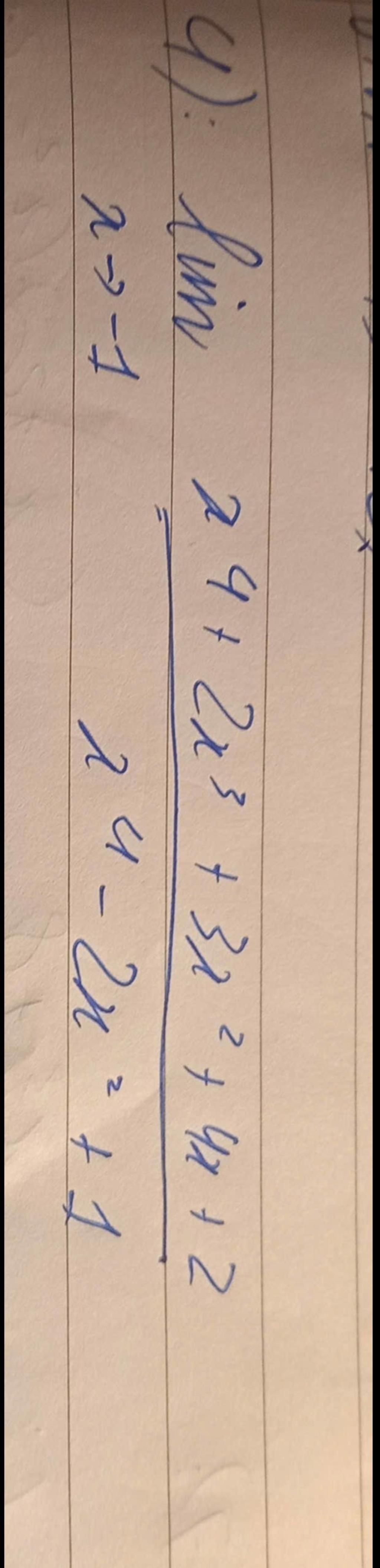 $\lim\limits_{x \to -1 }$ `(x^4 +2x^3 +3x^2 +4x +2)/(x^4 -2x^2 +1)`