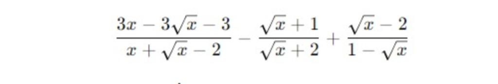 `(3x-3\sqrtx-3)/(x+\sqrtx-2)-(\sqrtx+1)/(\sqrtx+2)+(\sqrtx-2)/(1-\sqrtx)`