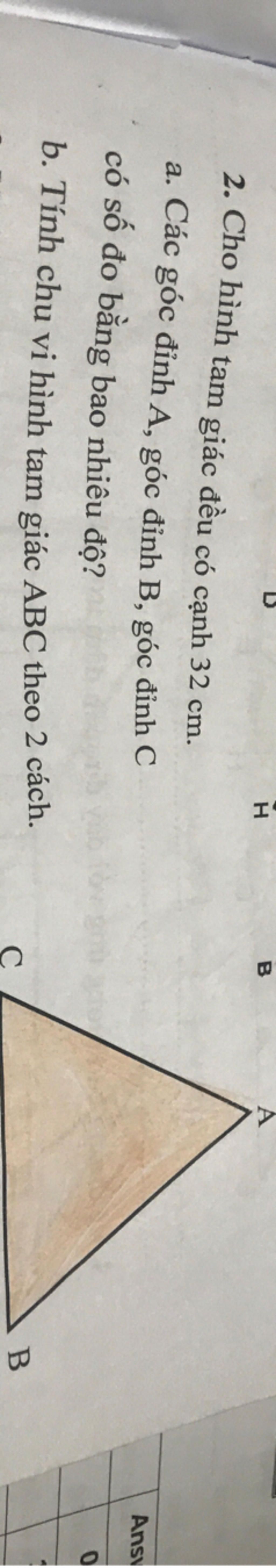 `a,` Vì tam giác `ABC` có `3` cạnh đều bằng `32 cm`