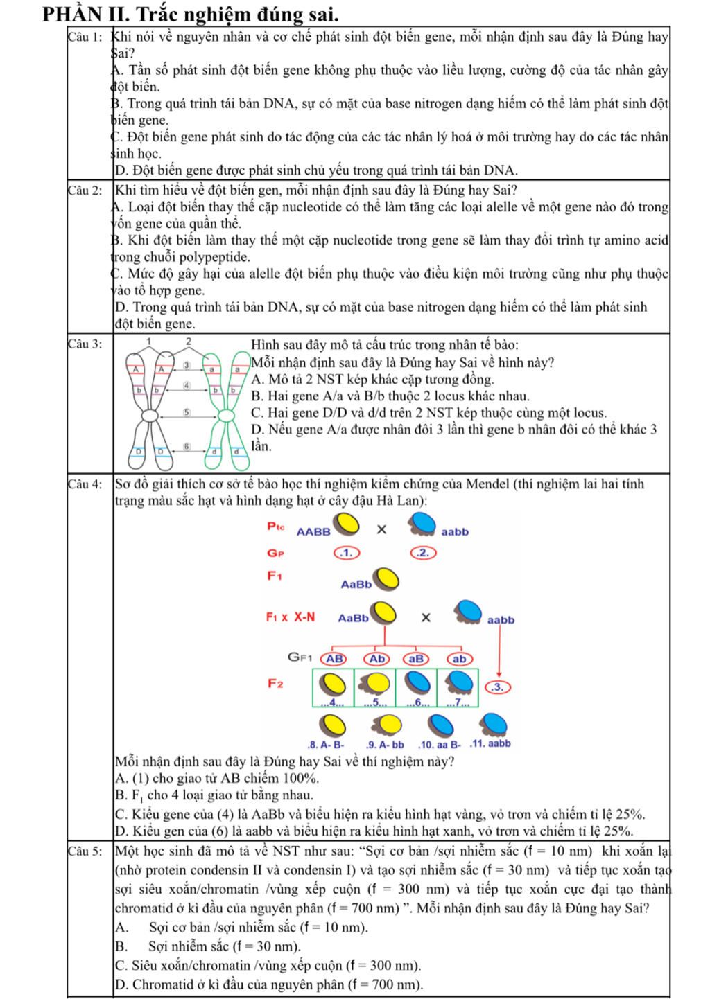 Câu 1: Khi nói về nguyên nhân và cơ chế phát sinh đột biến gene, mỗi nhận định sau đây là Đúng hay