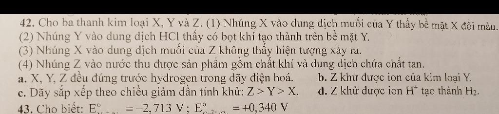 `(4)` Nhúng Z vào nước thu được khí và dd chứa chất tan `=> Z` là kim loại kiềm