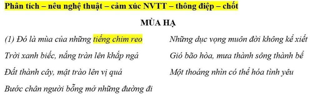 Trong khổ thơ đầu tiên của bài thơ "Mùa hạ" của Xuân Quỳnh, bức tranh mùa hạ được phác họa với sắc màu rực rỡ, tràn đầy sức sống và tươi mới qua ngôn từ giàu hình ảnh và cảm xúc. “Tiếng chim reo” – âm thanh quen thuộc mở ra không gian rộn ràng, báo hiệu sự sống căng tràn trong mùa hạ. Tiếng chim ấy như niềm vui, niềm hân hoan vang vọng khắp không gian, làm cho cảnh vật thêm phần sinh động. Nhà thơ mượn sắc xanh họa nên nên bầu trời “xanh biếc”,điểm tô những tia vàng lấp lánh khi nắng trải dài “tràn lên khắp ngả”, tất cả như được khoác lên mình gam màu tươi sáng của mùa hè. Không chỉ vậy, sức sống còn được diễn tả qua hình ảnh “đất thành cây, mật trào lên vị quả” – một sự chuyển hóa diệu kỳ của thiên nhiên khi đất trời giao hòa, cây cối đơm hoa kết trái ngọt ngào. Và con người trong khổ thơ cũng hòa vào nhịp điệu sôi động ấy, khi “bước chân người bỗng mở những đường đi”, gợi lên hình ảnh con người đầy khát khao, chủ động mở lối trong cuộc sống. Bằng ngôn từ dung dị, hàm súc, Xuân Quỳnh đã vẽ nên bức tranh mùa hạ không chỉ rực rỡ, căng tràn nhựa sống mà còn hàm chứa một niềm tin yêu, lạc quan về con người và cuộc đời.