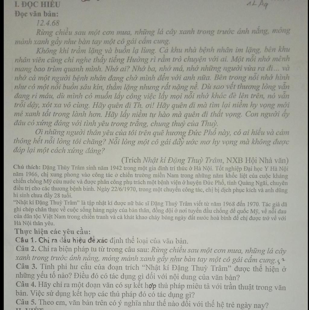 Câu 1: Đầu hiệu đề xác định thể loại của văn bản là “Nhật ký Đặng Thùy Trâm,” một thể loại tự truyện hoặc nhật ký, vì văn bản là những ghi chép của tác giả về những trải nghiệm và cảm xúc cá nhân trong thời gian làm việc tại chiến trường miền Nam.