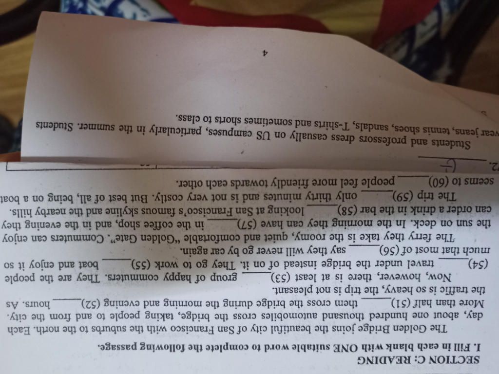 I. Fill in each blank with ONE suitable word to complete the following passage.