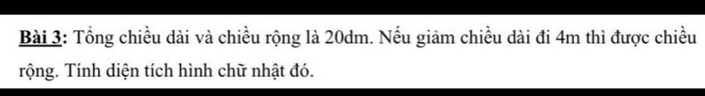Sửa đề : "Tổng chiều dài và chiều rộng là `20` `dm` . Nếu giảm chiều dài đi `4` `dm` thì được chiều rộng . Tính diện tích hình chữ nhật đó.