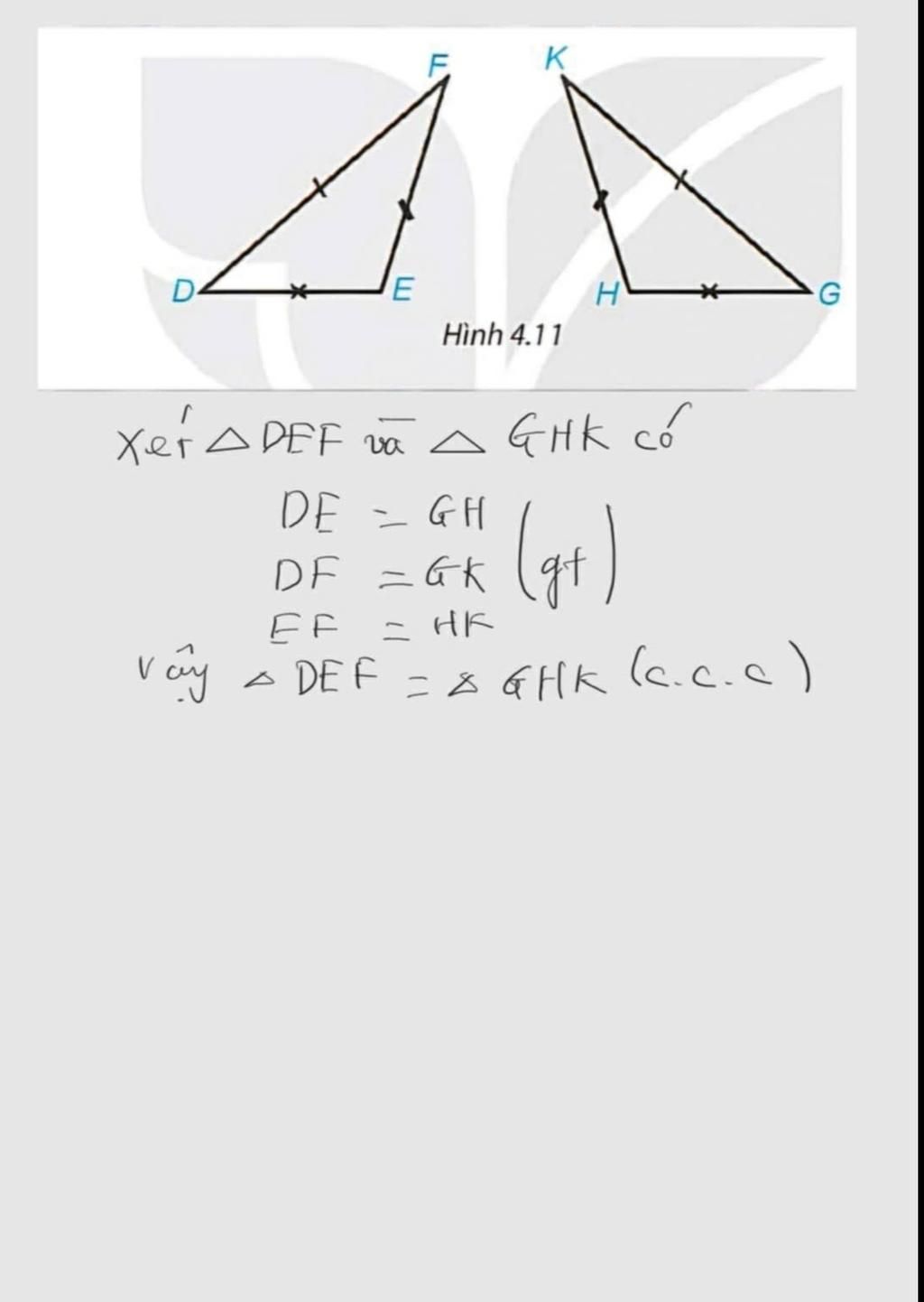 3 trường hợp bằng nhau của 2 tam giác : c.c.c , c.g.c , g.c.g và 2 trường hợp đặc biệt của tam giác vuông : ch-gn và ch-cgv Yêu cầu : vẽ được hình 2 tam giác bằng nhau ở các TH và viết lời giải như ví dụ sau