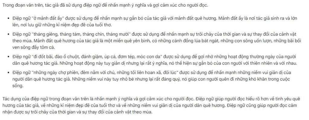 => Các phép điệp ngữ trong các đoạn thơ, đoạn văn đều có tác dụng làm nổi bật ý nghĩa, cảm xúc và thông điệp mà tác giả muốn truyền tải. Mỗi điệp ngữ không chỉ giúp nhấn mạnh ý, tạo điểm nhấn mà còn gợi lên những cảm xúc mạnh mẽ, từ sự cần cù trong lao động, sự tươi mới của thiên nhiên, đến tình yêu quê hương, sự trân trọng những khoảnh khắc và kỷ niệm gắn liền với cuộc sống.