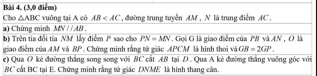 Cho AABC vuông tại A có AB < AC, đường trung tuyến AM, N là trung điểm AC.