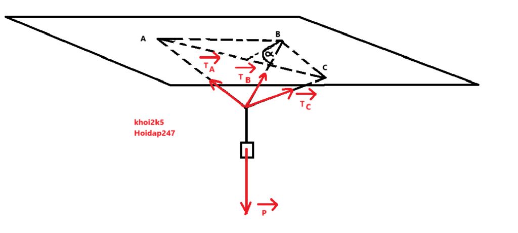Các lực `vecT_A , vecT_B ,vecT_C ` có độ lớn bằng nhau đều là `T (N)`, hợp lực theo phương song song với mặt trần bằng `0`.