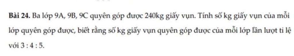 Vì số kg giấy vụn quyên góp được của ba lớp lần lượt tỉ lệ với `3,4,5` và ba lớp quyên góp được `240kg` giấy vụn nên ta có: