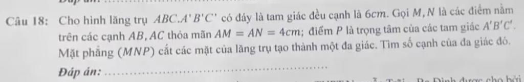 Câu 18: Cho hình lăng trụ ABC.A'B'C' có đáy là tam giác đều cạnh là 6cm. Gọi M,N là các điểm nằm