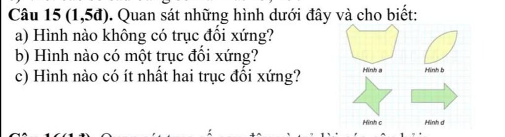 `b)` Hình `a;` hình `d` có `1` trục đối xứng