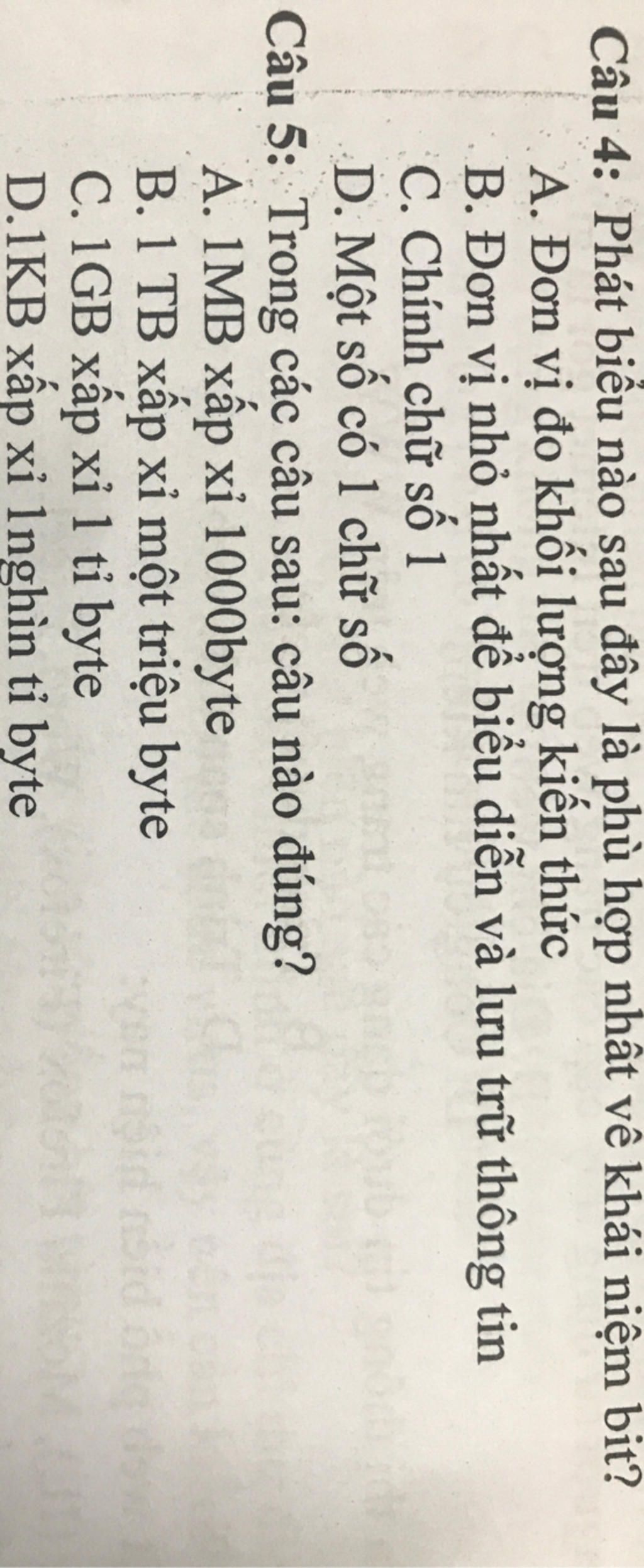 Câu 4 : B . Là đơn vị nhỏ nhất để biểu diễn và lưu trữ thông tin.