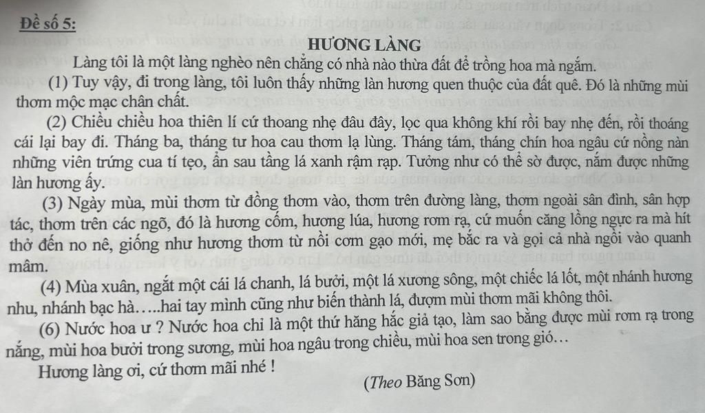 Câu 5. Chỉ ra phép liên kết câu có trong những câu văn sau: "Nước hoa ư? Nước hoa chỉ là một thứ hăng hắc giả tạo, làm sao bằng được mùi rơm rạ trong nắng, mùi hoa bưởi trong sương, mùi hoa ngâu trong chiều, mùi hoa sen trong gió...