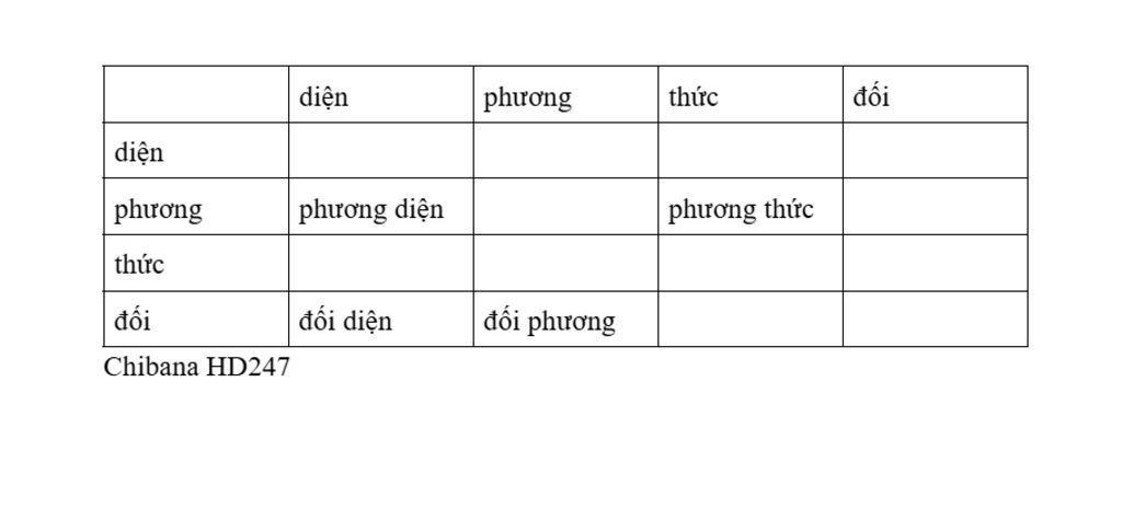 Từ các tiếng "diện", "phương", "thức", "đối", ta có thể ghép được với tất cả số từ là: