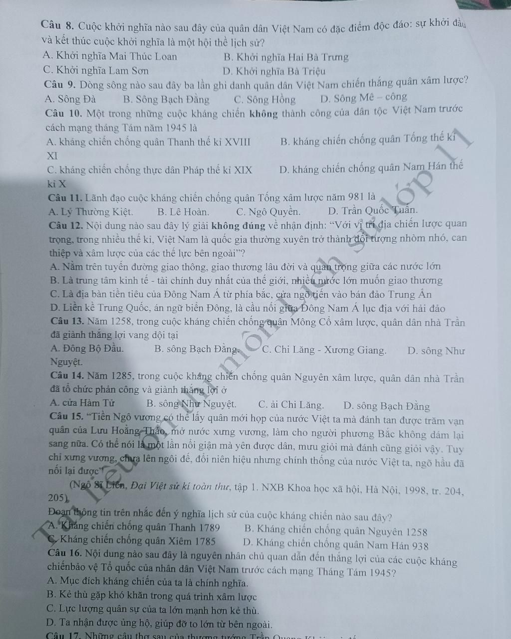 $\text{Câu 10:}$ C. Kháng chiến chống thực dân Pháp thế kỉ XIX
