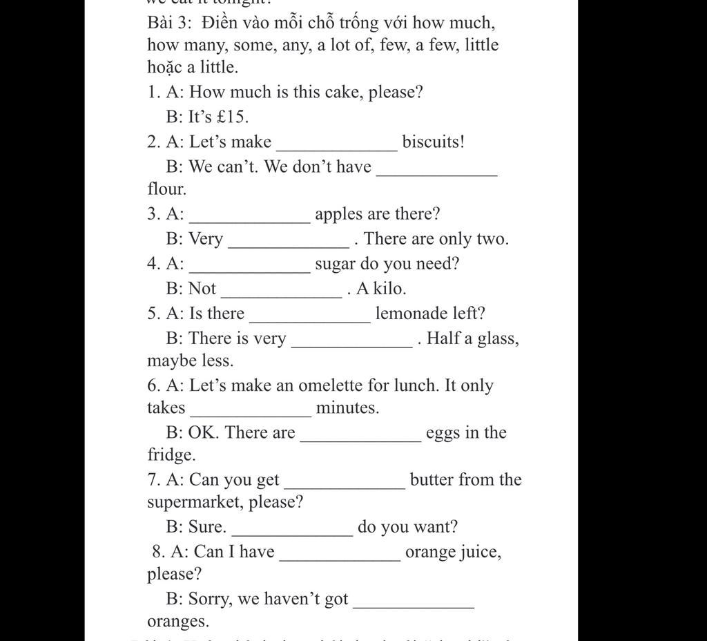 Bài 3: Điền vào mỗi chỗ trống với how much,