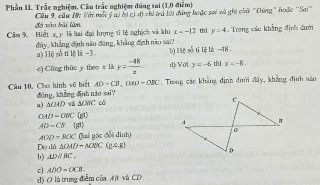 Câu 9, câu 10: Với mỗi ý a) b) c) d) chỉ trả lời đúng hoặc sai và ghi chữ “Đúng” hoặc “Sai”