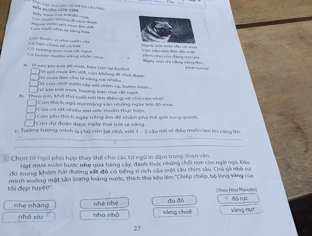 - dựa vào hai câu thơ đầu '' Mấy hôm nay trời đổ mưa / Cún buồn ko đi chơi được '' để trả lời .