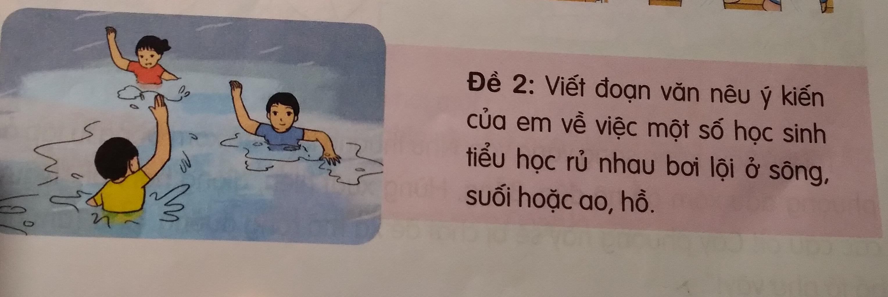 Việc học sinh tiểu học rủ nhau bơi lội ở sông, suối hoặc ao, hồ là hành động rất nguy hiểm. Các em còn nhỏ, chưa có đủ kỹ năng bơi lội tốt và khả năng xử lý tình huống khi gặp sự cố như nước chảy xiết hoặc chuột rút. Ngoài ra, sông, suối hay ao, hồ thường có đáy không bằng phẳng, nước sâu hoặc chứa nhiều vật cản nguy hiểm. Vì vậy, các em không nên tự ý đi bơi mà không có sự giám sát của người lớn và cần được hướng dẫn bơi ở những nơi an toàn như bể bơi có huấn luyện viên. Hành động cẩn thận này không chỉ bảo vệ tính mạng của chính mình mà còn tránh gây lo lắng cho gia đình.