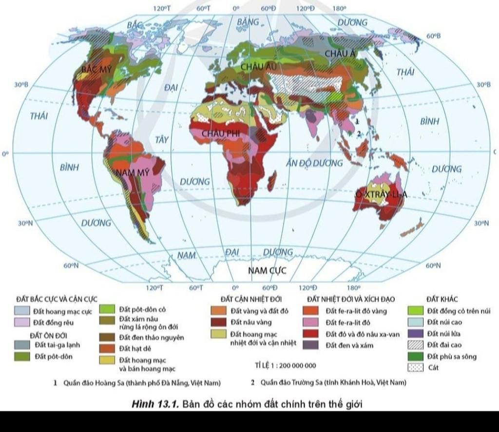 `bbtext{Cực}`$\\$ `+` Nhóm đất chính: Đất hoang mạc cực, đất đồng rêu. $\\$`+` Nhóm thực vật chính: Hoang mạc lạnh, đài nguyên, rừng lá kim. $\\$`bbtext{Ôn đới}`$\\$ `+` Nhóm đất chính: Đất tai-ga lạnh, đất pốt-dôn, đất pốt-dôn cỏ, đất xám nâu rừng lá rộng ôn đới, đất đen thảo nguyên, đất hạt dẻ, đất đai cao. $\\$`+` Nhóm thực vật chính: Đài nguyên, rừng lá kim, rừng lá rộng và rừng hỗn hợp ôn đới, hoang mạc và bán hoang mạc, rừng và cây bụi lá cứng cận nhiệt, thảo nguyên, cây bụi chịu hạn và đồng cỏ núi cao. $\\$`bbtext{Nhiệt đới}`$\\$ `+` Nhóm đất chính: Đất vàng và đất đỏ, đất nâu vàng, đất hoang mạc nhiệt đới và cận nhiệt, đất đỏ và đỏ nâu xavan, đất đen và xám, đất fe-ra-lit đỏ, đất fe-ra-lit đỏ vàng, đất phù sa sông. $\\$`+` Nhóm thực vật chính: Rừng cận nhiệt ẩm, rừng lá kim, thảo nguyên, cây bụi chịu hạn và đồng cỏ núi cao, hoang mạc và bán hoang mạc, rừng nhiệt đới xích đạo, rừng và cây bụi lá cứng cận nhiệt, xavan và cây bụi. $\\$`bbtext{Xích đạo}`$\\$ `+` Nhóm đất chính: Đất đỏ và đỏ nâu xavan, đất đen và xám, đất fe-ra-lit đỏ, đất fe-ra-lit đỏ vàng, đất đai cao. $\\$`+` Nhóm thực vật chính: Rừng nhiệt đới xích đạo, xavan và cây bụi, thảo nguyên, cây bụi chịu hạn và đồng cỏ núi cao.