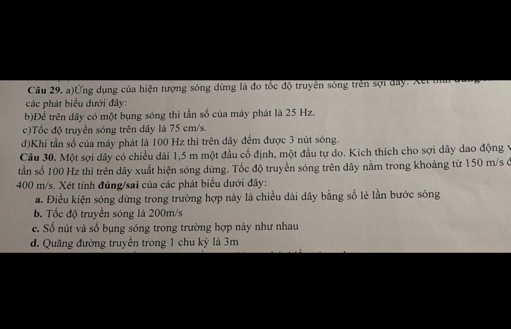Câu 29. a)Ứng dụng của hiện tượng sóng dừng là đo tốc độ truyền sóng trên sợi day.
