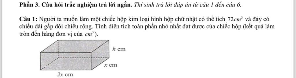 Câu 1: Người ta muốn làm một chiếc hộp kim loại hình hộp chữ nhật có thể tích 72cm và đáy có