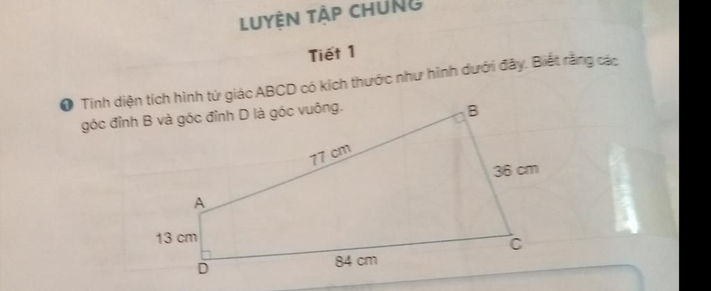 Tính diện tích hình tứ giác ABCD có kích thước như hình dưới đây biết rằng các góc đỉnh b và góc đỉnh d là góc vuông