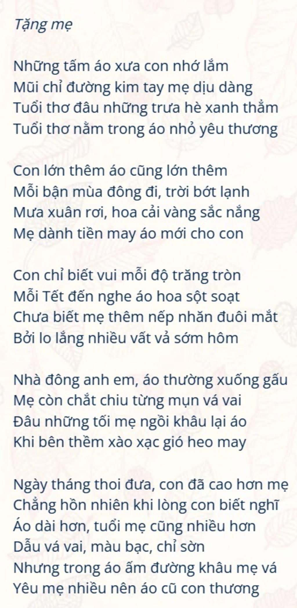 "Mẹ là người duy nhất trên thế giới này yêu thương ta vô điều kiện, che chở ta bằng tất cả tình yêu và sự hy sinh". Hình ảnh "tấm áo" trong bài thơ "Tặng mẹ" là biểu tượng sâu sắc của tình yêu thương vô điều kiện và sự hy sinh thầm lặng của người mẹ. Tấm áo không chỉ đơn thuần là vật che thân mà còn là món quà tinh thần chứa đựng bao tình cảm, là minh chứng cho những đêm khuya mẹ thức giặt, may từng chiếc áo, chăm chút cho con từng chút một. Qua từng mũi chỉ, từng đường kim của mẹ, chiếc áo dần trở thành sự bảo bọc, là niềm an ủi vững chắc trong những mùa đông lạnh giá hay những ngày mưa xuân tươi đẹp. Tấm áo ấy cũng theo con lớn lên, là lời nhắc nhở về tuổi thơ giản dị nhưng đầy ấm áp trong vòng tay mẹ. Câu thơ "Áo dài hơn, tuổi mẹ cũng nhiều hơn" không chỉ phản ánh sự trưởng thành của con mà còn là sự bộc lộ rõ ràng những vất vả, lo toan của mẹ khi tuổi tác càng tăng lên, dù vậy, tình yêu mẹ dành cho con vẫn vẹn nguyên. Dẫu chiếc áo đã sờn màu, vá vai, nhưng trong đó vẫn là sự hy sinh âm thầm, là tình yêu không lời của mẹ, là dấu ấn không thể phai nhòa trong tâm hồn mỗi người con. Tấm áo ấy, dù cũ, vẫn luôn ấm áp bởi những tình cảm thiêng liêng mà mẹ dành cho, là niềm tự hào, là sự trân quý mà con mang theo suốt cuộc đời.