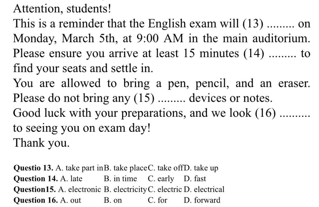 `-` Xin nhắc lại rằng kỳ thi tiếng Anh sẽ diễn ra vào Thứ Hai, ngày 5 tháng 3, lúc 9 giờ sáng tại khán phòng chính.