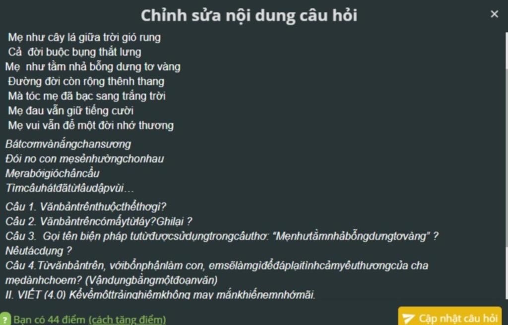 Câu 1. Vănbảntrênthuộcthểthơgì? Câu 2. Vănbảntrêncómấytừláy?Ghilại ? Câu 3. Gọi tên biện pháp tutừđượcsửdụngtrongcâuthơ: “Mẹnhưtằmnhảbỗngdưngtơvàng” ?Nêutácdụng ? Câu 4.Từvănbảntrên, vớibổnphậnlàm con, emsẽlàmgìđểđáplạitìnhcảmyêuthươngcủa cha mẹdànhchoem? (Vậndụngbằngmộtđoạnvăn) II. VIẾT (4.0) Kểvềmộttrảinghiệmkhông may mắnkhiếnemnhớmãi.