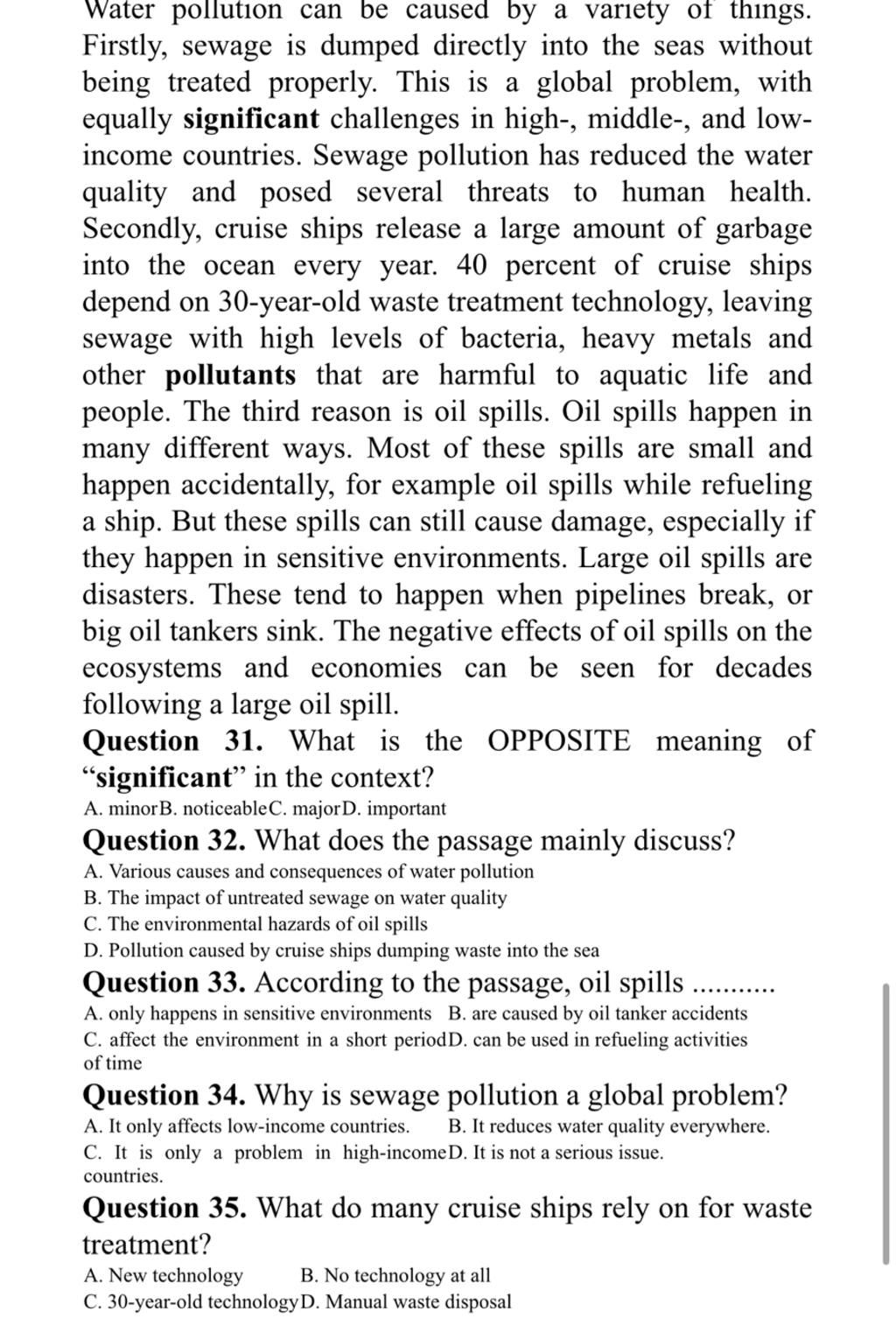 `-` Dẫn chứng: 40 percent of cruise ships depend on 30-year-old waste treatment technology, leaving sewage with high levels of bacteria, heavy metals and other pollutants