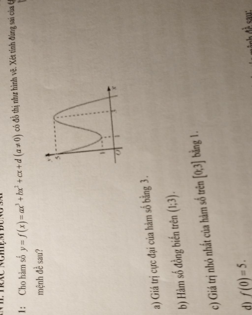`c)` Đúng vì trên đoạn `[ 0,3]` hàm số đạt cực tiểu tại `x=1` nên giá trị của hàm số `f(1)=1`