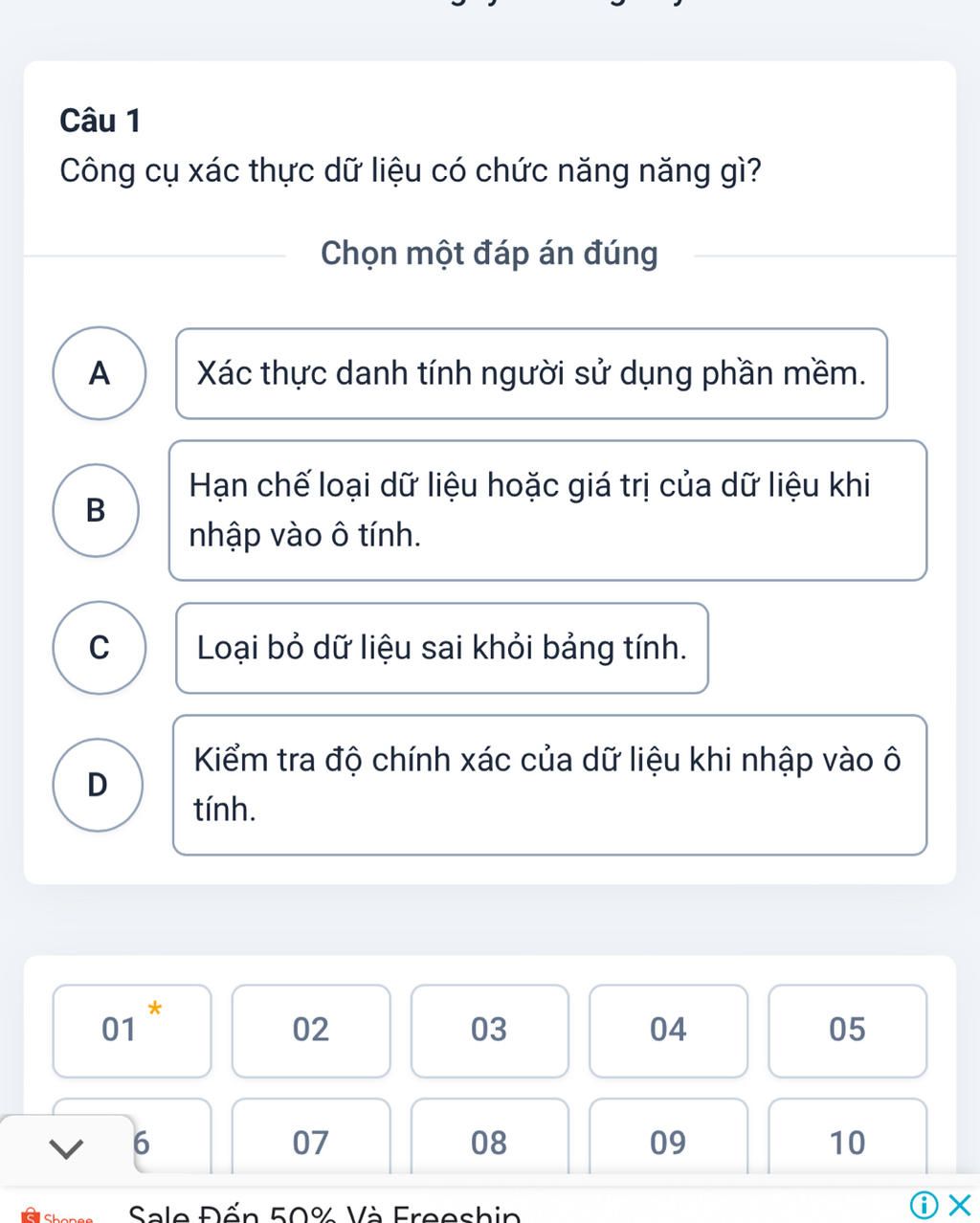 Đáp án B: Hạn chế loại dữ liệu hoặc giá trị của dữ liệu khi nhập vào ô tính